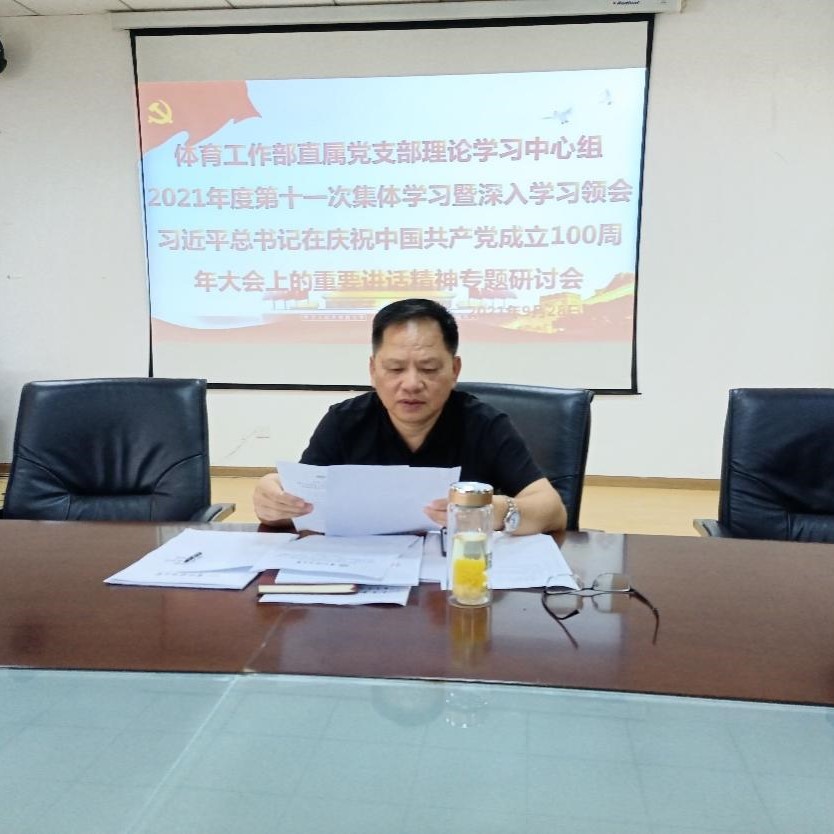 9月28日,体育工作部直属党支部理论学习中心组召开2021年度第十一次集体学习暨深入学习领会习近平总书记在庆祝中国共产党成立100周年大会上的重要讲话精神专题研讨会,会议由直属党支部书记李国和主持。