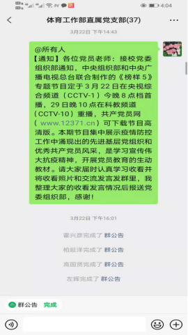 根据公司相关通知要求,3月22日体育工作部直属党支部主要通过线上通知并组织党支部全体党员于3月22日晚8点在央视综合频道(CCTV-1)或29日晚10点在科教频道(CCTV-10),或点击共产党员网( www.12371.cn)观看