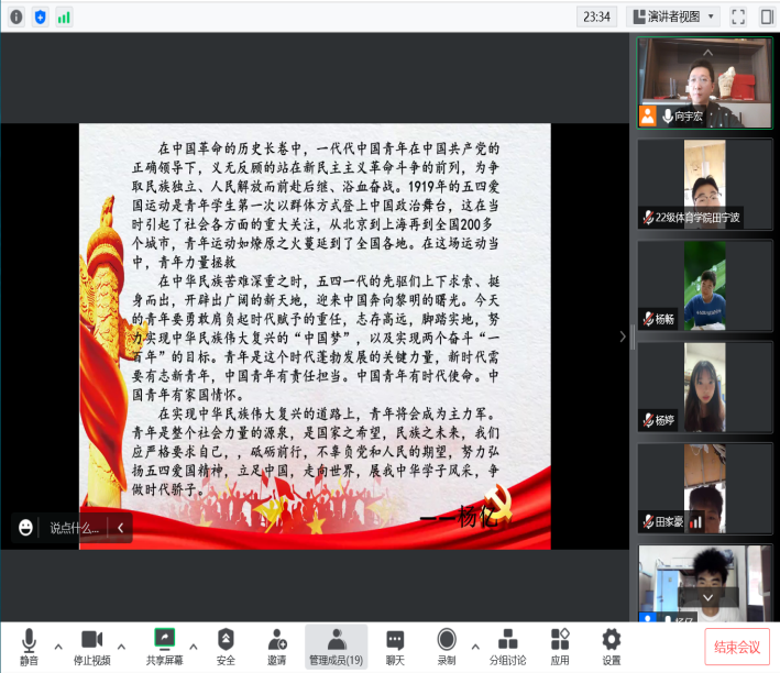 2022年9月17日,公司体育经济与管理1、2班团支部积极响应公司团委要求,通过腾讯会议平台开展“喜迎二十大、永远跟党⾛、奋进新征程”主题教育活动,联合入团积极分子展开了关于“党的青年运动史”学习心得分享,参与人数共计41名同学(团员23名,非团员18名)。