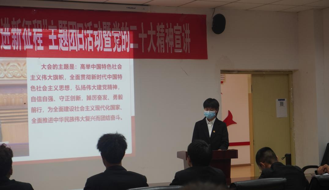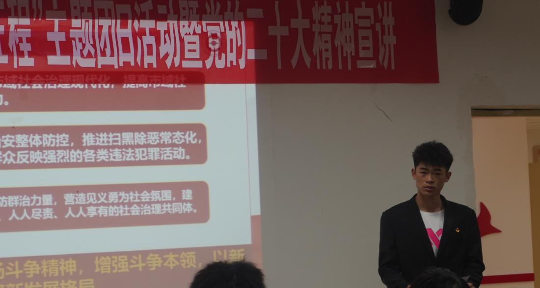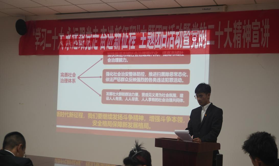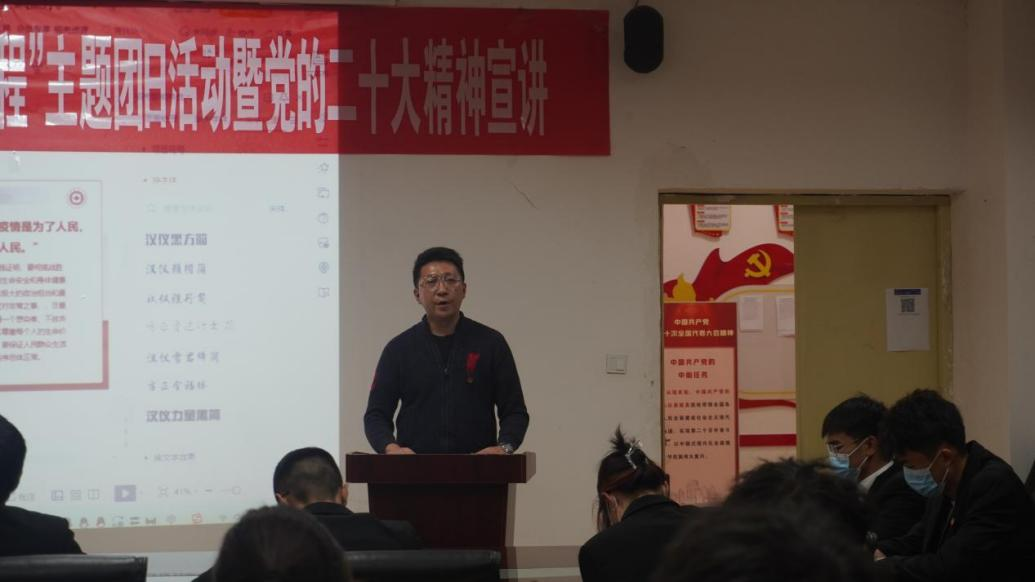 员工团员代表华一铭他从8个方面向同学们宣讲了党的二十大精神,强调要深刻领会党的二十大主题,深刻领会过去五年的工作和新时代十年的伟大变革,深刻领会开辟马克思主义中国化时代化新境界,深刻领会中国式现代化的中国特色和本质要求,深刻领会全面建设社会主义现代化国家的目标任务,深刻领会教育科技人才、法治建设、国家安全等方面的重大部署,深刻领会坚持党的全面领导和全面从严治党的重大部署,深刻领会应对风险挑战的重要要求。