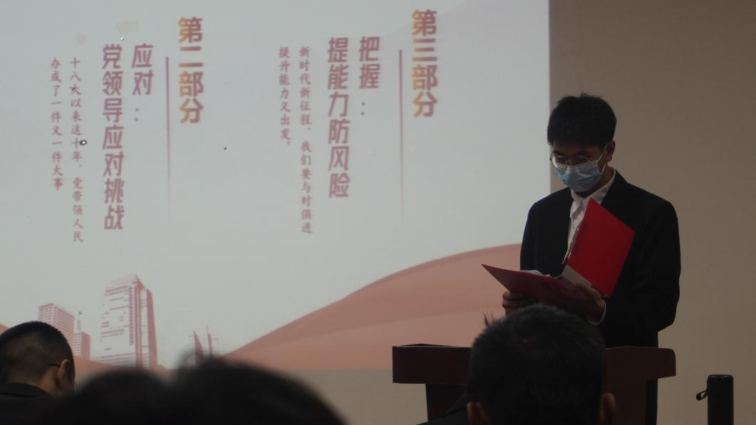 员工团员代表杨亿从党和人民事业具有重大现实意义和深远历史意义的三件大事:一是迎来中国共产党成立一百周年,二是中国特色社会主义进入新时代,三是完成脱贫攻坚、全面建成小康社会的历史任务,实现第一个百年奋斗目标为全体学员解读了党的二十大报告精神。