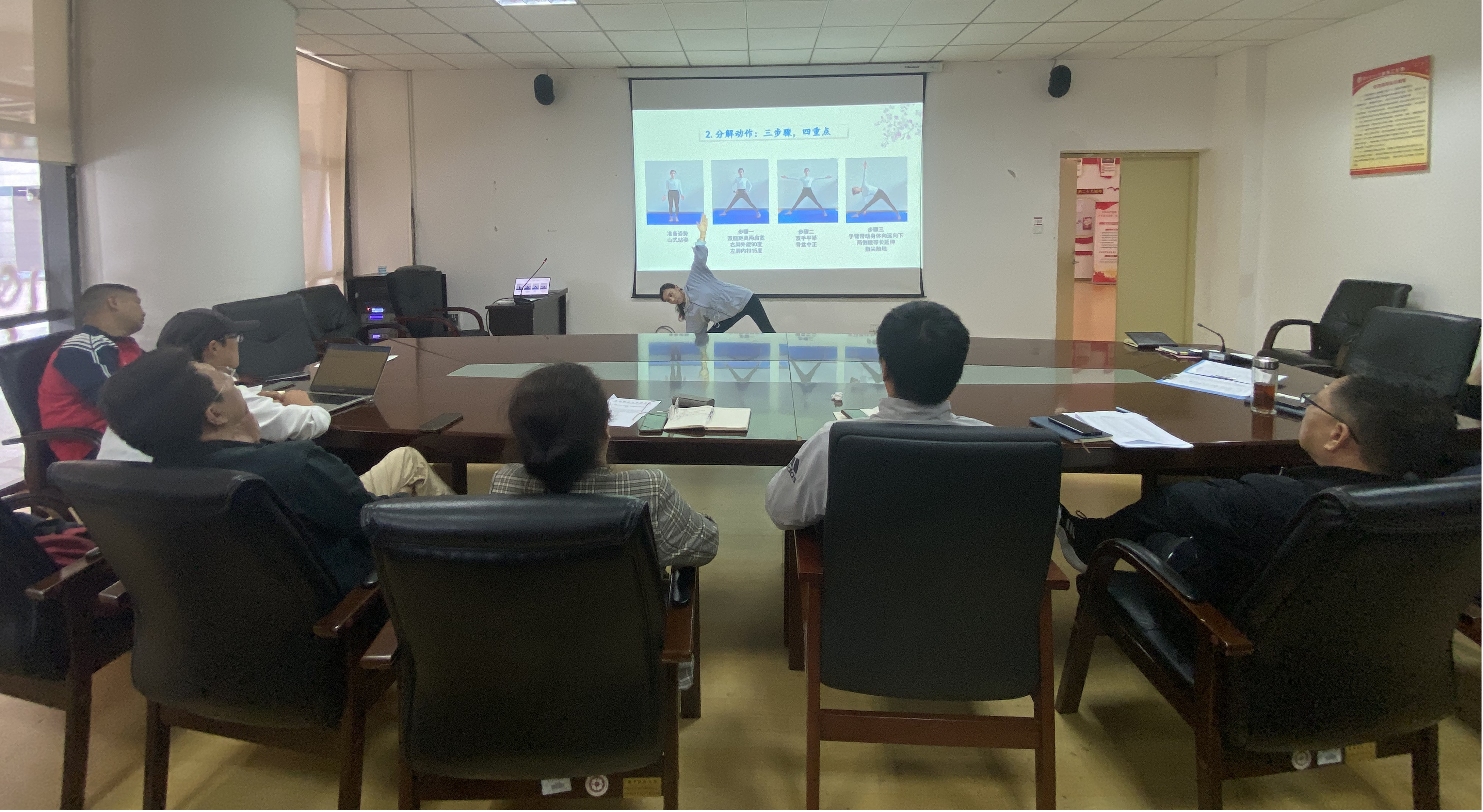 首先,本次优质示范课的优秀教师赵桑晴老师为大家带来了《瑜伽三角伸展式》的课程,赵老师以饱满的热情和专业的示范,引领同学们感受排舞的魅力,耐心地讲解动作要领,细致地纠正姿势,让员工们在轻松愉快的氛围中掌握了三角伸展式的技巧。课堂上,赵老师还注重培养团队合作和助人为乐的精神,通过分组练习和展示,激发了学习积极性和创造力。
