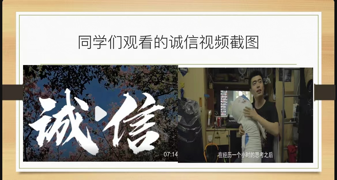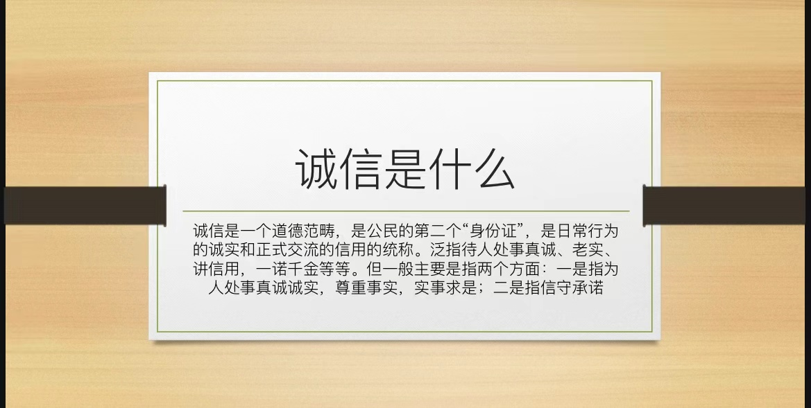 第二部分,宣讲人向大家展示了一个关于诚信教育的小视频。视频里的小故事诙谐幽默又寓教于乐,让大家在愉快的氛围中也对诚信有所感悟,也将“诚信教育”四个字深深记在心里。