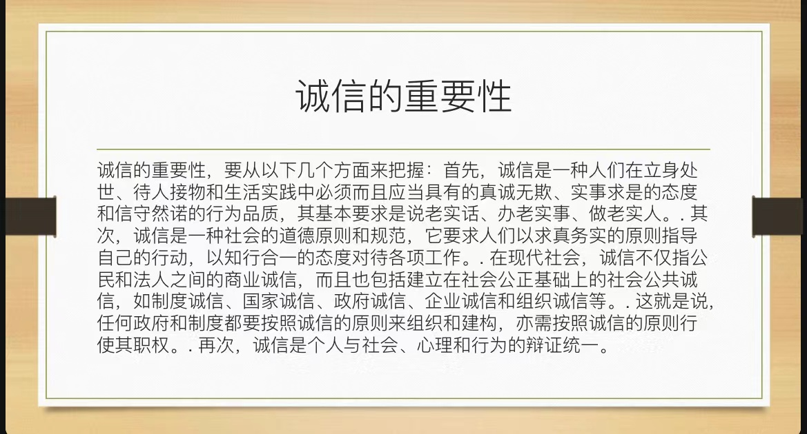 最后,宣讲人向大家介绍了公司诚信教育的要求及考试违纪、作弊处理办法。诚信的红线是不可触碰的!“诚信教育”宣讲活动在宣讲人对大家的考试的鼓励中悄然结束。活动虽然就此结束,但诚信之风长存!