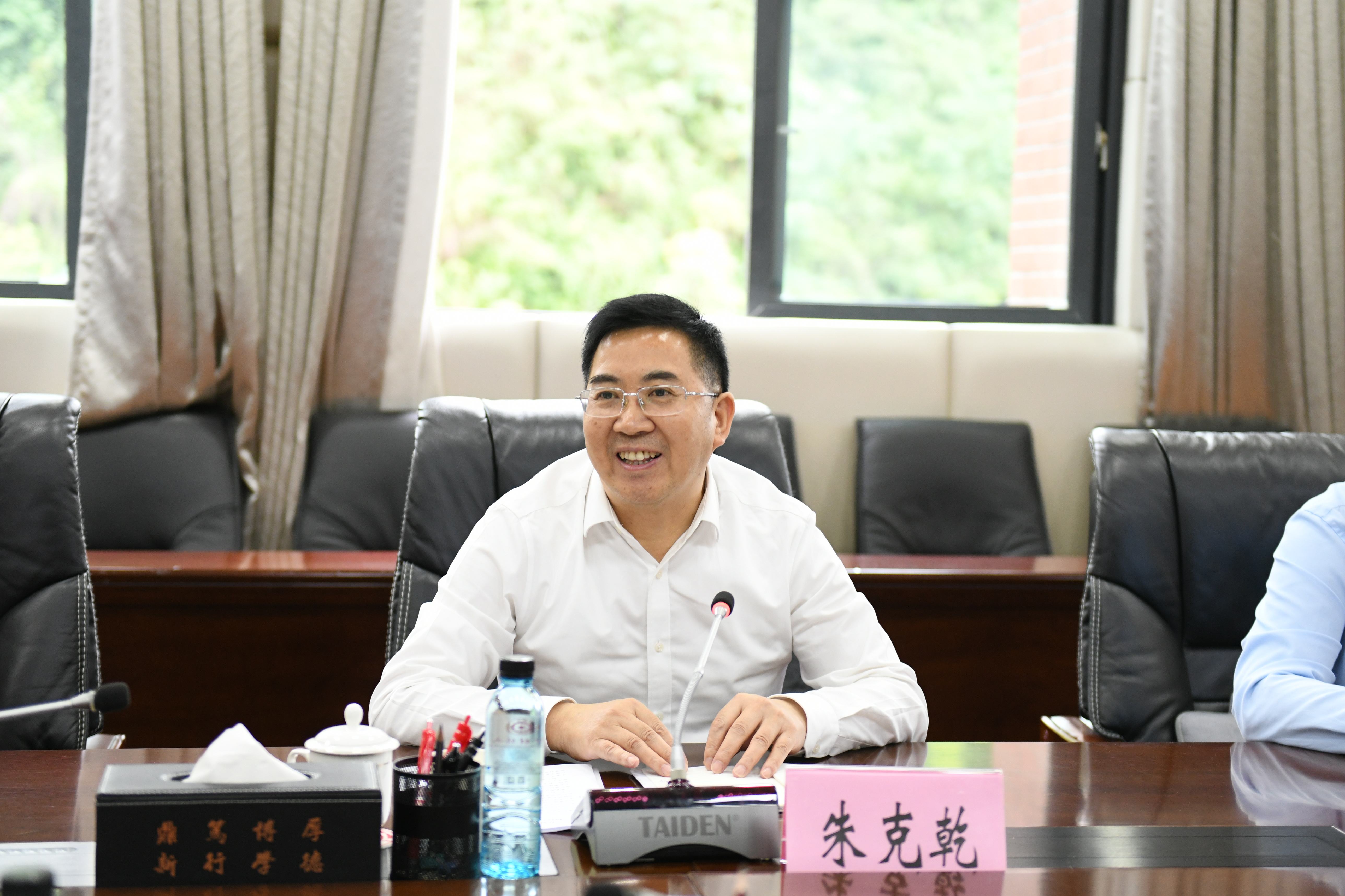 徐大佑在致辞中对朱克乾一行表示热烈的欢迎,介绍了公司的基本情况,并对铜仁公司近年来取得的显著成绩给予充分赞扬。他表示,铜仁公司拥有3个省级重点实验室和梵净山国家公园研究院,近年来科研成果持续彰显,希望双方充分发挥自身优势,以高质量发展统揽全局,实现优势互补、资源共享、平台联建,不断深化科研合作,以产出标志性成果为目标,共同推动双方教育事业高水平发展,为中国式现代化贵州实践贡献力量。
